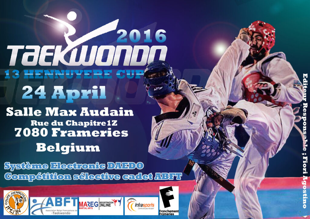 La 13ème Coupe Hennuyère du dimanche 24 avril 2016 est organisée comme chaque année par le Taekwondo Imjin Academy. La compétition aura lieu au Hall Omnisports Max Audain – Rue du Chapitre 1Z à 7080 Frameries